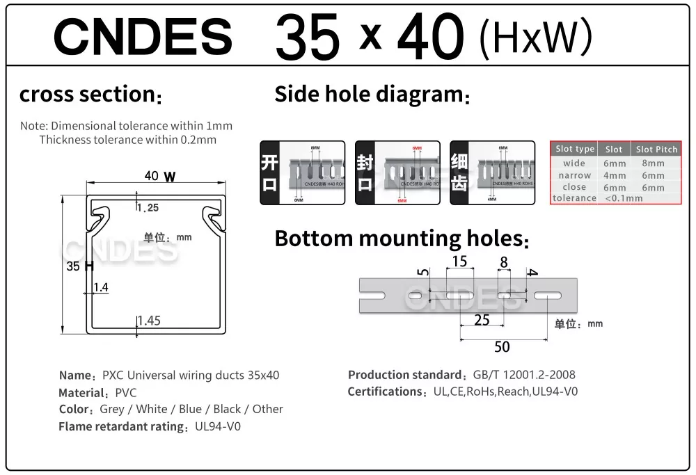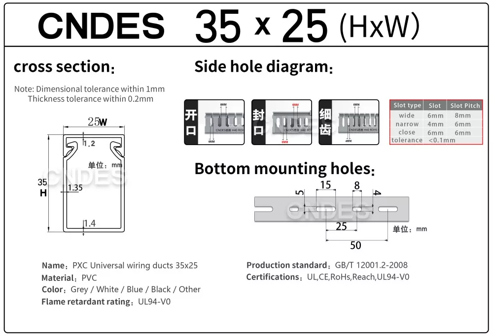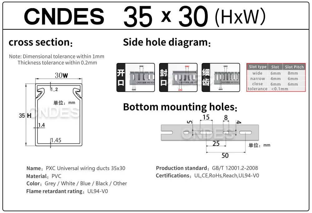 चीनको कम्पनी CNDES द्वारा निर्मित अनुकूलित 35mm उचाइ स्लटेड PVC तार राउटिङ डक्टमा कडा PVC आधार र हटाउन सकिने कभर हुन्छ। आधारमा दुवै छेउमा छाप लगाइएका औँला-जस्तै समतामूलक खाँचहरू छन्, जसले "कम्बी दाँत" बनाउँछ। यी दाँतहरू हातले भाँच्न सकिन्छ, तारलाई कुनै पनि स्थितिबाट तेर्सो रूपमा बाहिर निस्कन अनुमति दिन्छ। कभर सजिलै ठाउँमा फर्किन्छ, सफा उपस्थिति कायम राख्छ। तल माउन्टिंग प्वालहरूको पङ्क्ति DIN 43659 मानक स्पेसिङ अनुरूप छ। यसलाई M5 स्क्रू वा रिभेट्स प्रयोग गरेर प्यानलहरू, क्याबिनेट फ्रेमहरू, वा समान संरचनाहरूमा छिटो सुरक्षित गर्न सकिन्छ।