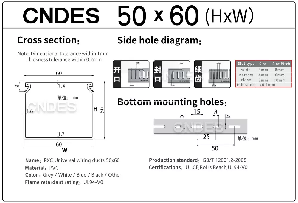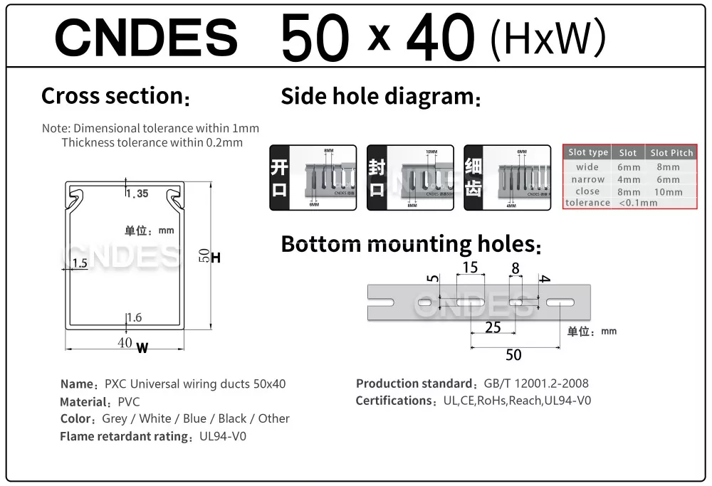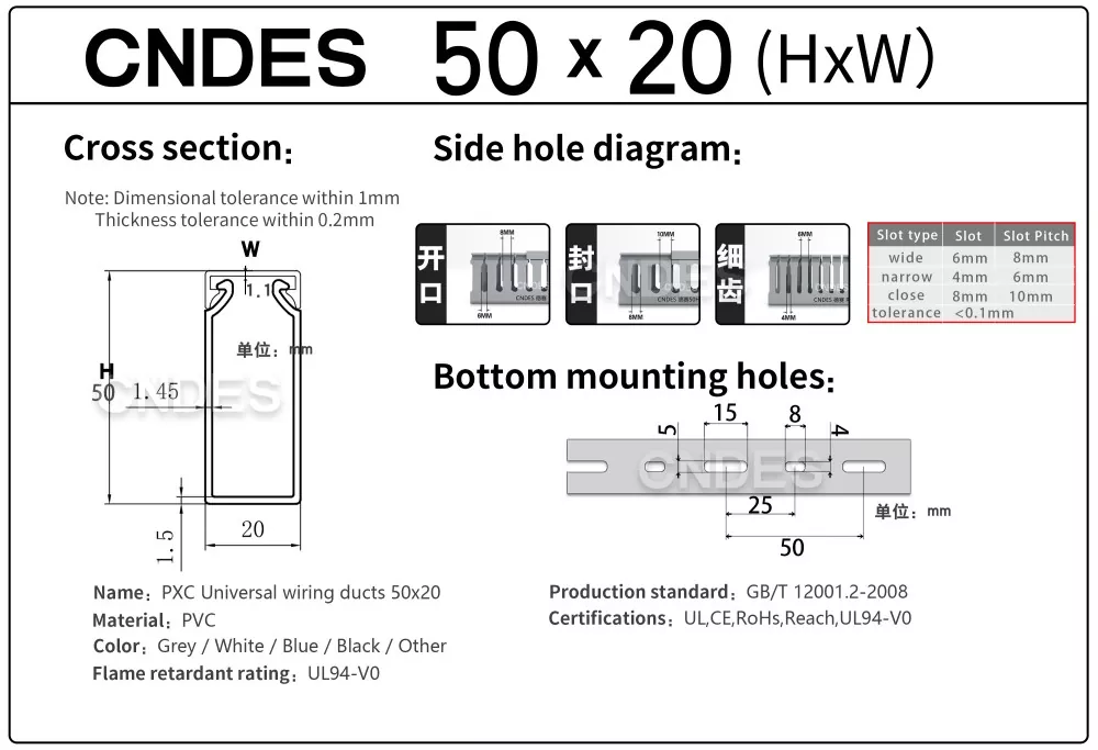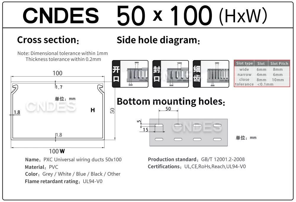 CNDES स्लटेड PVC प्यानल तारिङ डक्ट आपूर्ति गर्न मा विशेषज्ञता निर्माता र आपूर्तिकर्ता हो। यहाँ हामी निम्न विनिर्देशहरू सहित हाम्रो 50mm उच्च तारिङ ट्रंकिङ परिचय गर्नेछौं: 50*20,50*25,50*30,50*35,50*40,50*45,50*50,50*55,50*60,50*80,50*100।