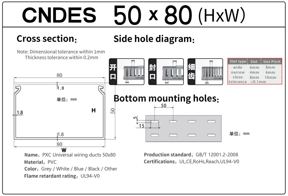 केबल डक्ट रेकर्डको लागि विशिष्टता: साइड होल प्रकार, तल प्वाल प्रकार, उत्पादन मोटाई, आदि।