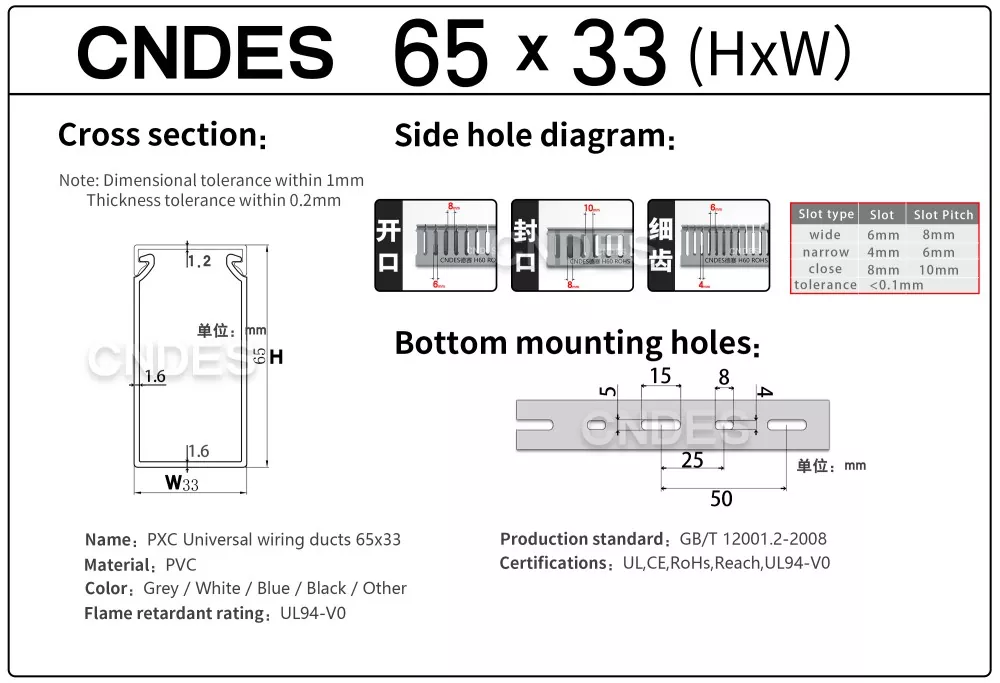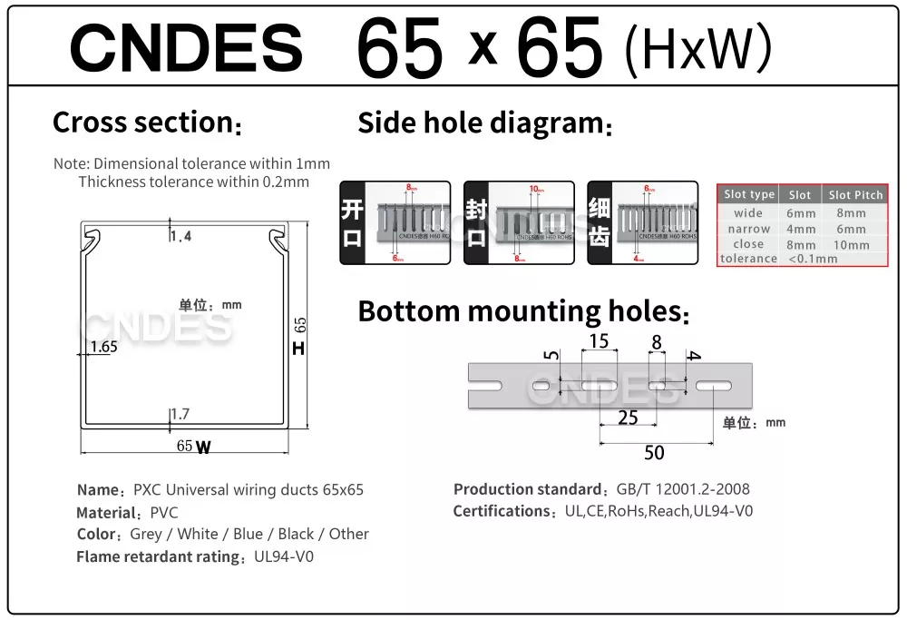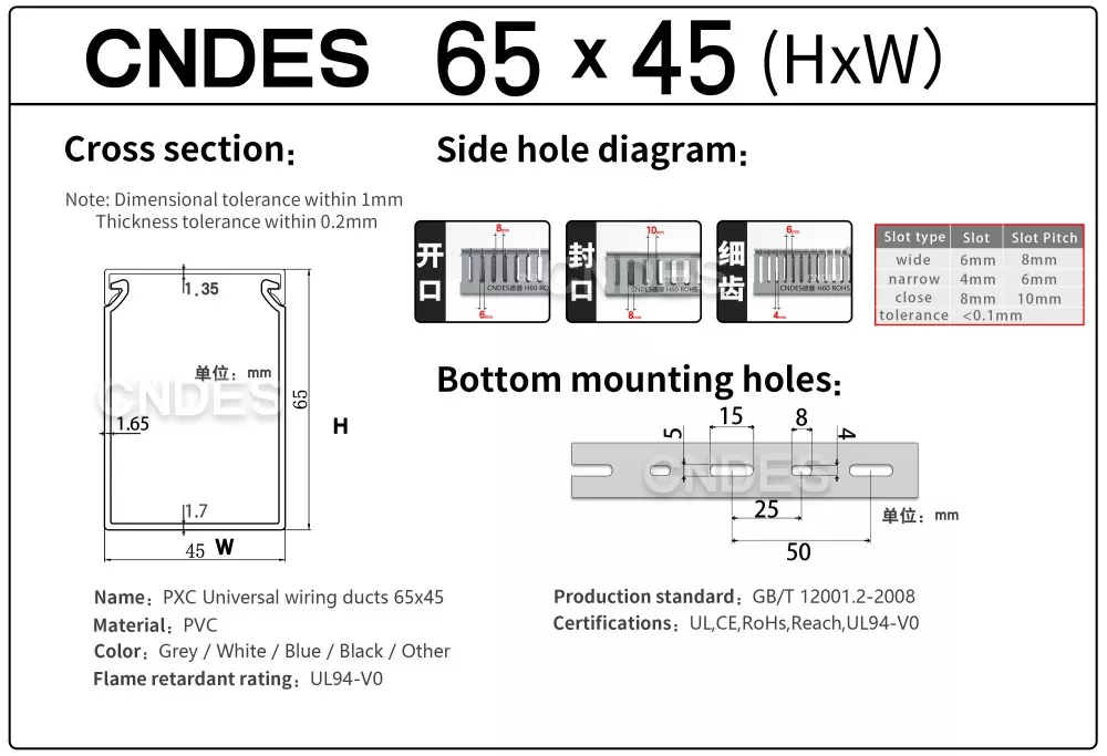 CNDES २४ वर्षको अनुभव भएको PVC केबल तारिङ डक्ट स्रोत कारखाना हो। अनुकूलित 65mm उचाइ स्लटेड PVC औद्योगिक वायरिङ डक्ट औद्योगिक नियन्त्रण प्यानल, स्वचालन उपकरण, र मेसिनरी स्थापनाहरू जस्ता उच्च घनत्व वातावरणमा तारहरू व्यवस्थित गर्न र सुरक्षा गर्नको लागि एक आदर्श समाधान हो। 65mm को उचाइको साथ, यसले ठूला केबल बन्डलहरू समायोजन गर्न पर्याप्त ठाउँ प्रदान गर्दछ जबकि वातावरणीय कारकहरू जस्तै धुलो, नमी, र मेकानिकल क्षतिबाट इष्टतम सुरक्षा सुनिश्चित गर्दछ।