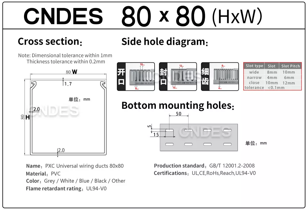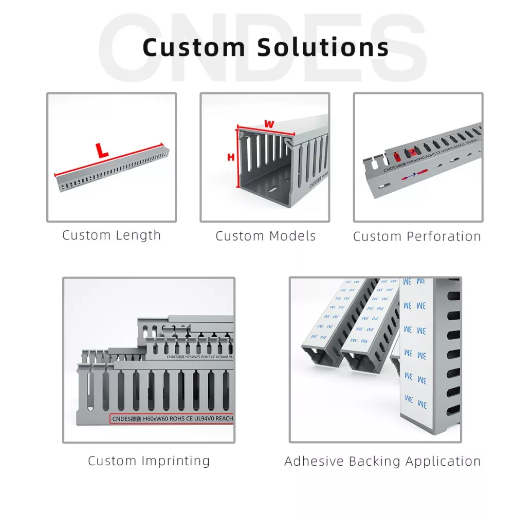 जब मानक केबल ट्रेहरूले जटिल तार हार्नेसहरू समायोजन गर्न असफल हुन्छन्, CNDES अनुकूलित 80×80 स्लटेड PVC स्विचबोर्ड तारिङ डक्ट तपाईंको राम्रो विकल्प हो। 80mm*80mm को ठूलो आन्तरिक स्पेसको साथ, यो विशेष गरी डाटा सेन्टर ब्याकबोन केबलिङ, औद्योगिक उपकरण पावर क्लस्टरहरू, र ठूला नियन्त्रण क्याबिनेटहरूमा केन्द्रीकृत तारहरू जस्ता उच्च-मांग परिदृश्यहरूको लागि डिजाइन गरिएको हो। यसले सजिलैसँग ठूलो संख्यामा केबलहरू समायोजन र व्यवस्थित गर्दछ, एक पटक र सबैको लागि अव्यवस्था र भीडलाई विदाई दिन्छ।